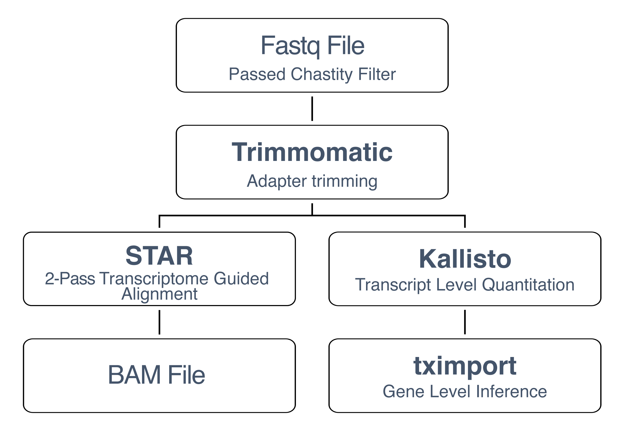 The analyzed data is created by taking the raw FASTQ file and processing it through the following RNA-seq data pipeline: